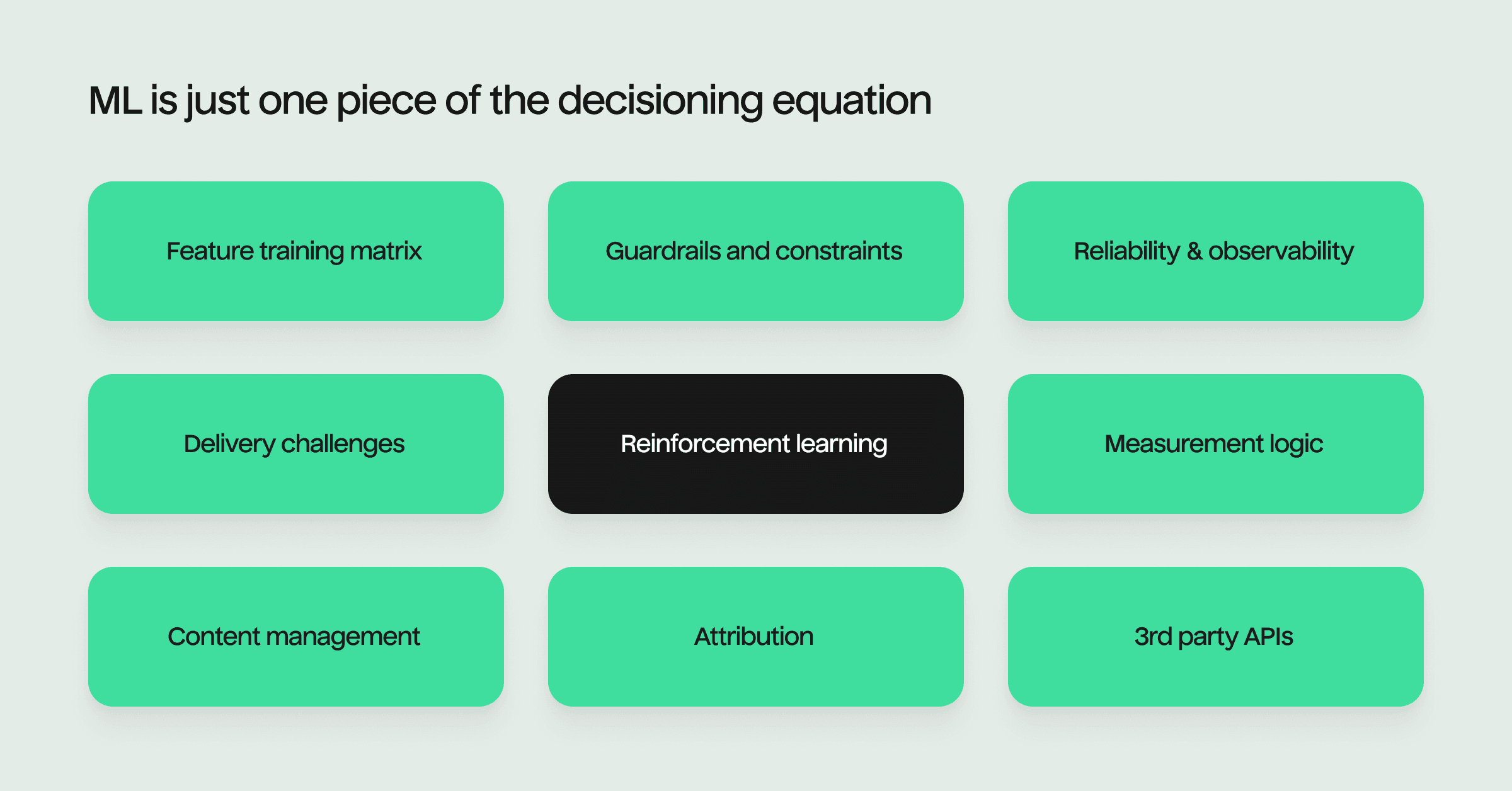 They successfully built contextual bandits that showed performance lift. But they couldn't build a platform that marketers could actually use. The algorithms worked, but the UI, observability, and integrations became the bottleneck. As their data science lead explained, "We built our own decisioning engine internally for two years. Although it showed lift, the tradeoff didn't make sense versus buying off the shelf and focusing on our data foundation and models that feed the platform."