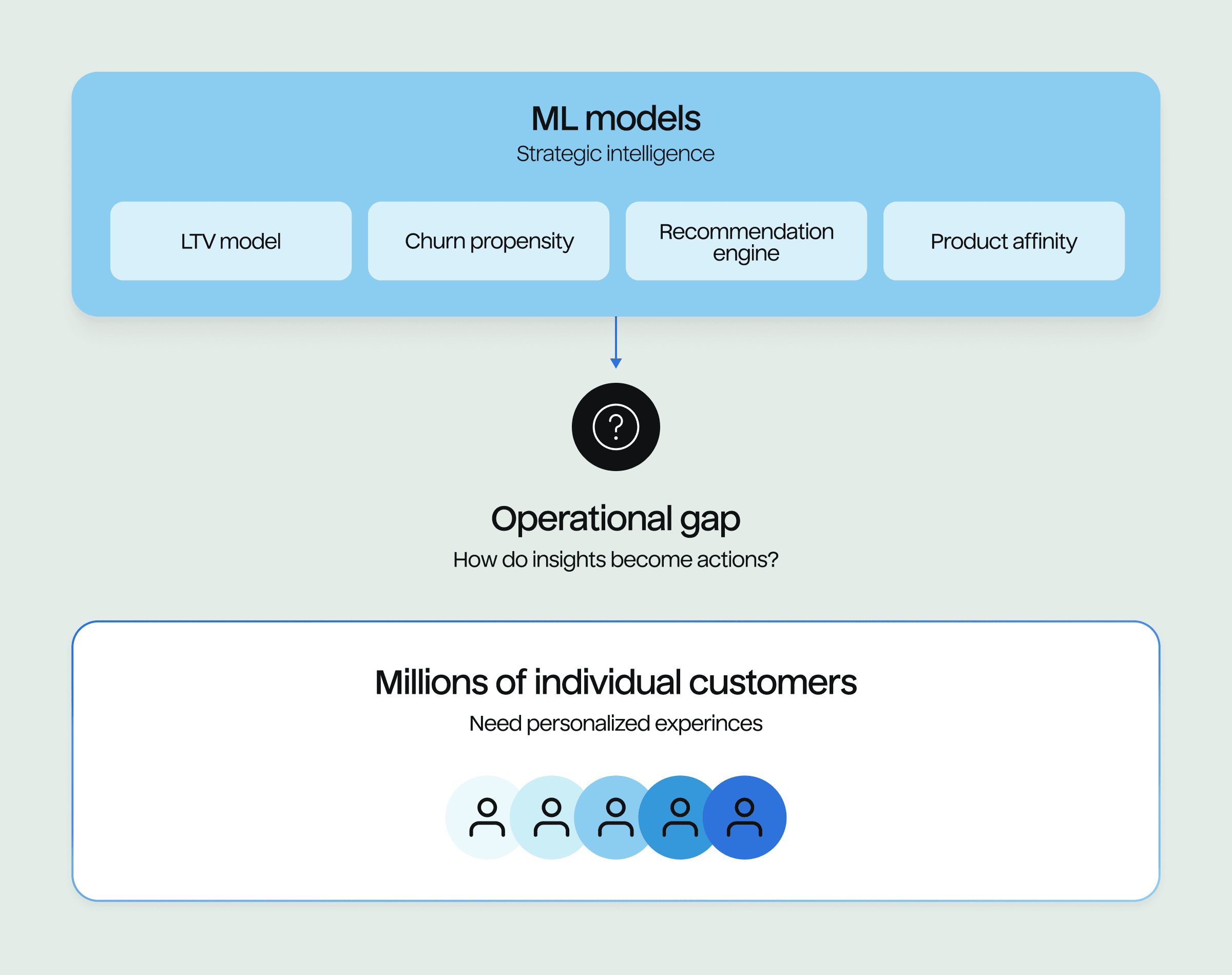 Every company with sophisticated ML faces the same operational challenge. Your models provide predictions, but turning those predictions into personalized experiences at scale requires additional tools and capabilities.