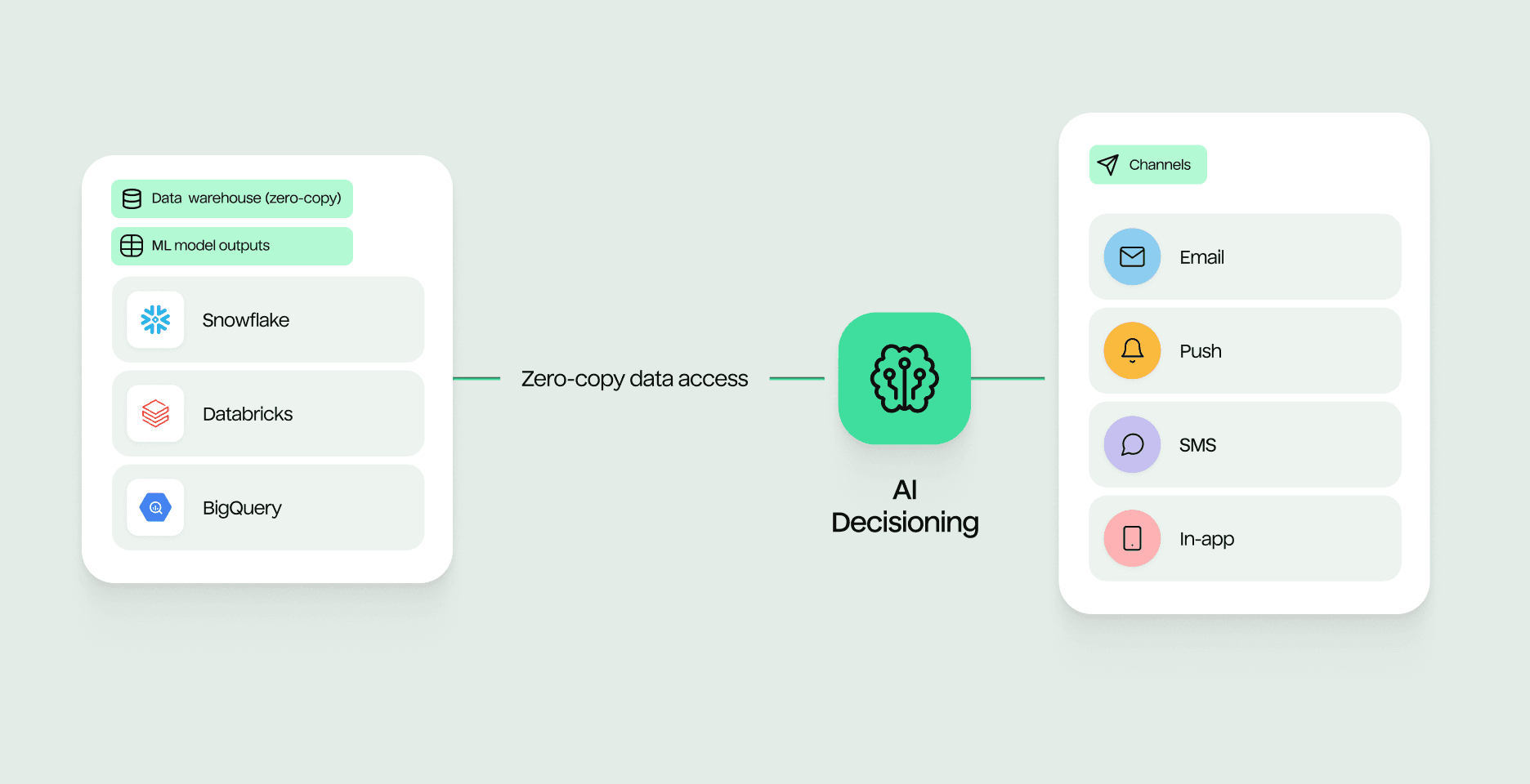 AI Decisioning provides the operational tooling your models need. It's warehouse-native with zero-copy architecture on cloud data warehouses like Snowflake, Databricks, and BigQuery. This means no data movement, no complex pipelines, and no sync issues. Your models stay in your infrastructure, under your control. And because it's modular, you can adopt it alongside your existing CDP and email service provider without ripping and replacing your current stack.