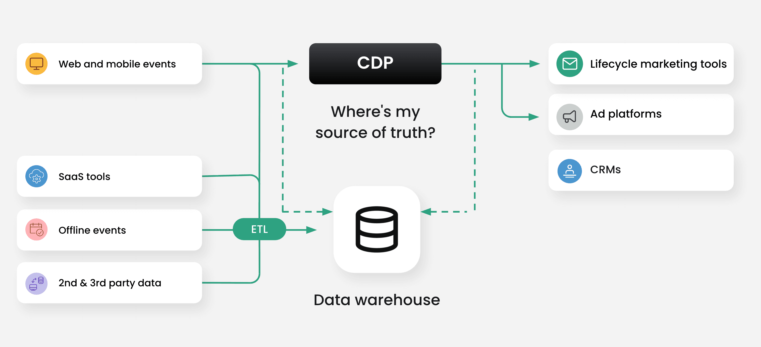 Within a few years, the warehouse became the center of gravity for enterprise data. But it created a new tension: marketing's CDP-based view of the customer was increasingly incomplete and misaligned with the richer truth living in the warehouse.