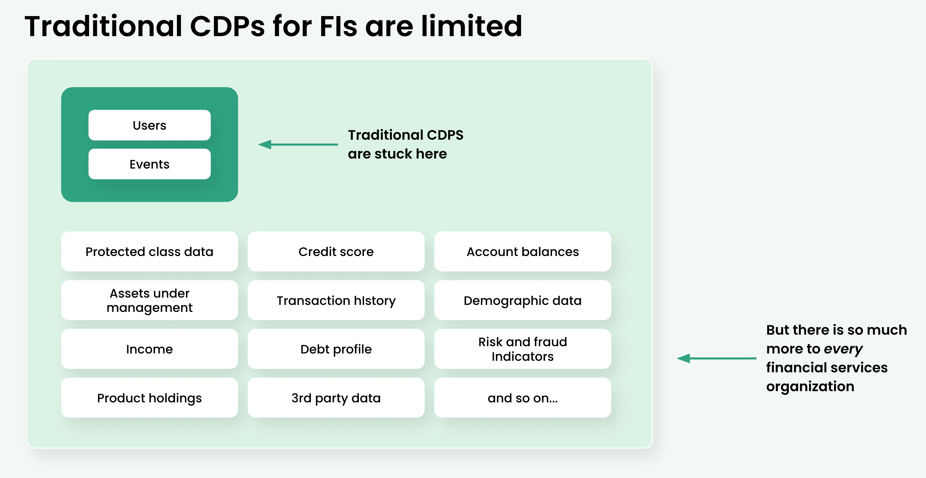 They only see a sliver of your data. These platforms were built to ingest "user" and "event" data: web clicks, email opens, app sessions. Financial institutions have far richer data—account hierarchies, transaction categorizations, risk scores, loan applications, advisor-client relationships. Traditional CDPs struggle to model this complexity, and integrating it requires expensive custom engineering.