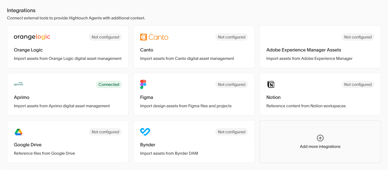 Generic AI tools tend to fail because they lack context. Their outputs look “reasonable” but are rarely on-brand. For content creation, context typically means brand guidelines and existing creative. When using Hightouch, you can either manually upload information in any format or directly connect to DAMs, design tools, and more.