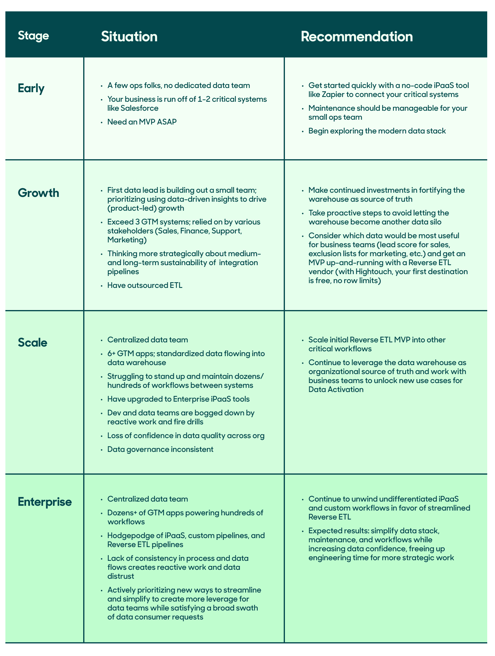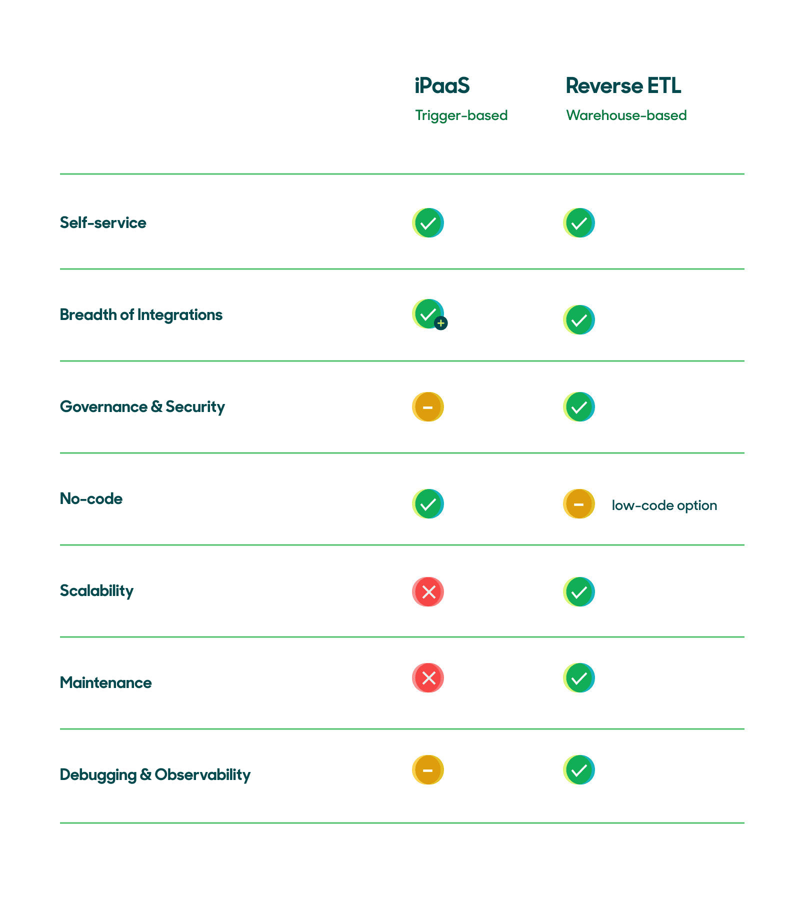 In general, as your architecture, systems, and team scale, it will become increasingly onerous to rely purely on iPaaS solutions, and Reverse ETL should be considered and evaluated. From a budget and data trust standpoint, by leveraging a central source of truth (the data warehouse), Reverse ETL delivers operating efficiencies and data consistency that point-to-point solutions cannot match.