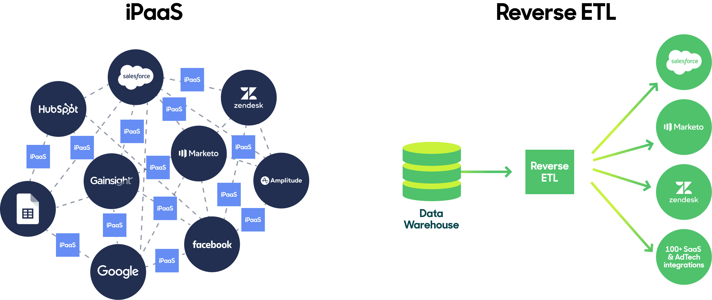 Diagram of iPaaS architecture vs. Reverse ETL architecture.
