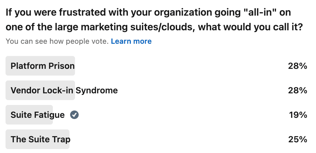 While it didn't get the most votes, I prefer the term “Suite Fatigue” because it isn't as harsh as some of the others! It reflects the fact that suites still have value, while recognizing the mounting frustration marketing teams are experiencing.