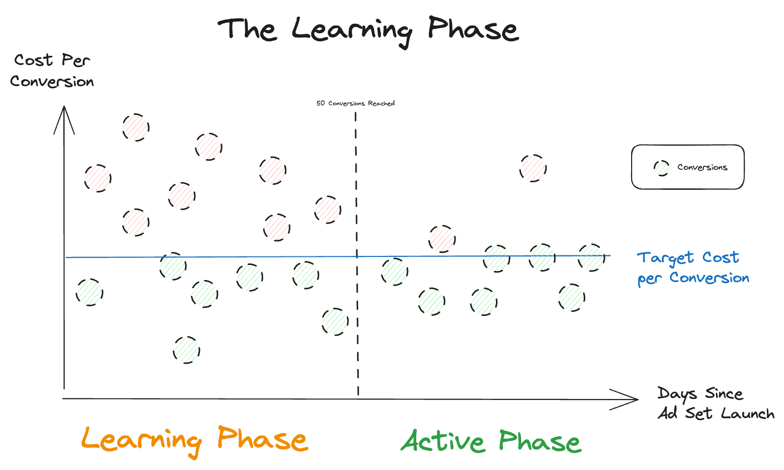 Once a new ad set is launched, the platform tests diverse audiences, placements, and tactics through trial and error. The goal of the Learning Phase is to train algorithms to optimize your campaign's performance in the long run to meet your objectives.