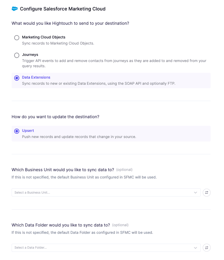 With the Facebook Custom Audience sync complete, it’s time to set up the Salesforce Marketing Cloud sync. Follow the same steps above to create a sync to Salesforce Marketing Cloud, except this time select Salesforce Marketing Cloud as your destination.