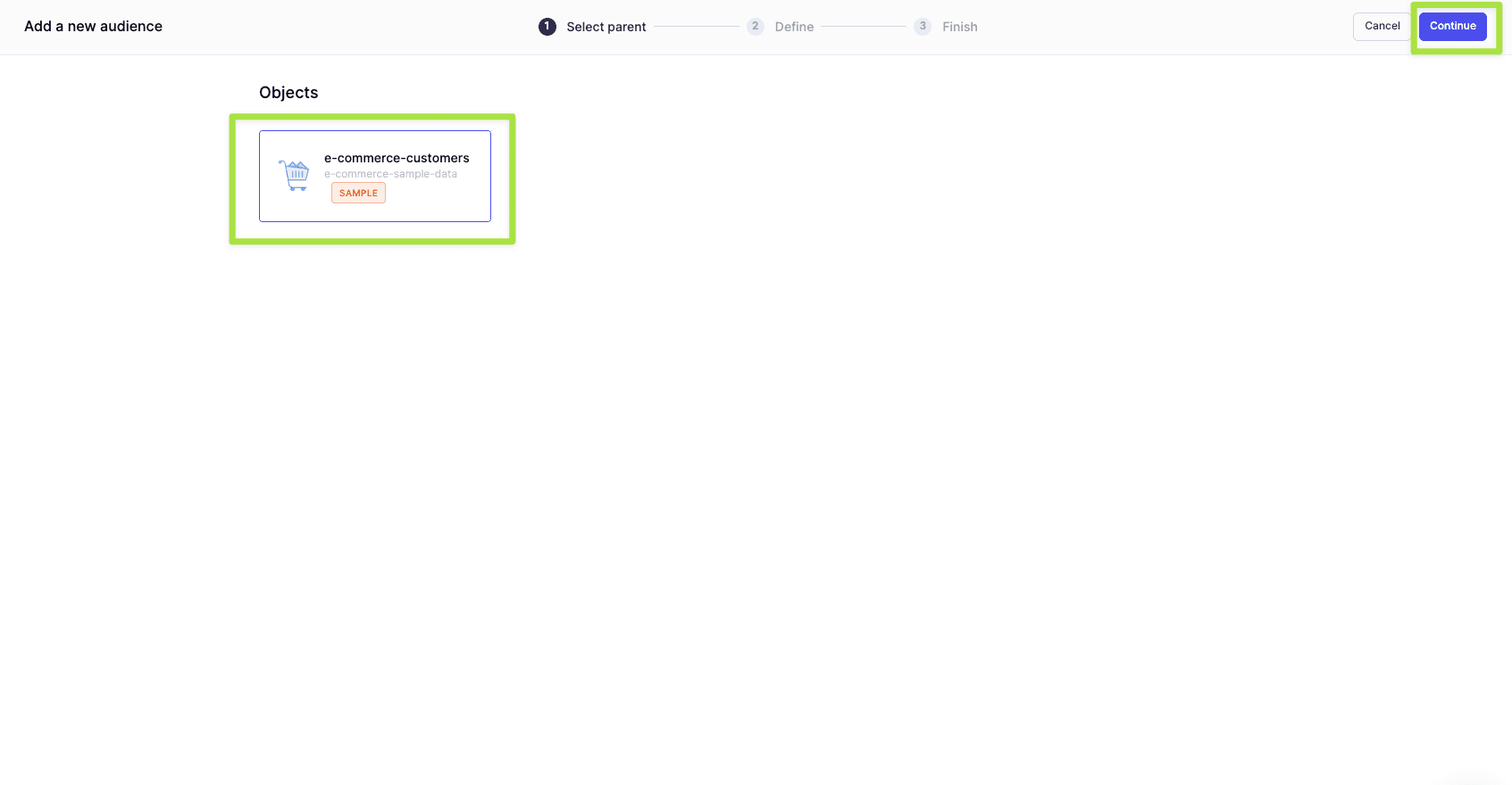Navigate to Audiences and click Add audience. From here select your customer data object and click Continue.
