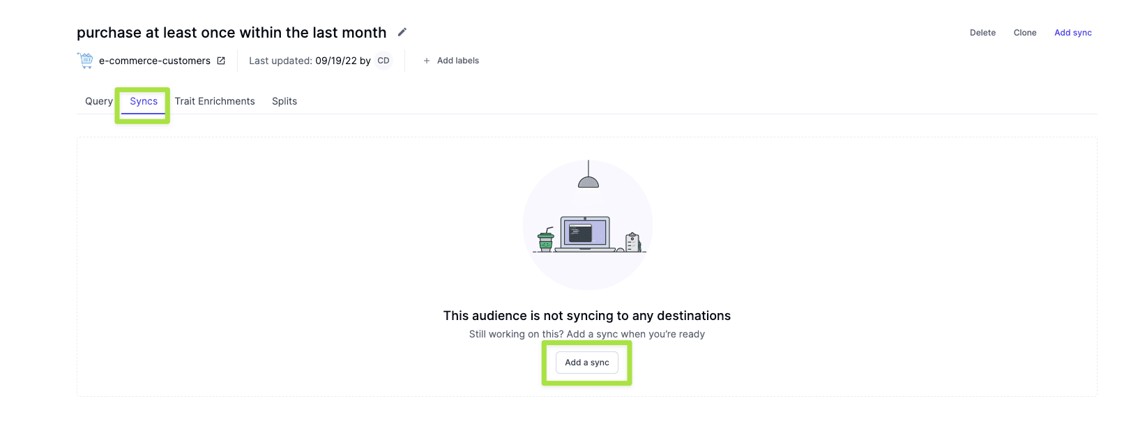With your audience built, it's time to create your sync to Facebook and Salesforce Marketing Cloud. Click on the audience you've created. From there navigate to Syncs and click Add sync.