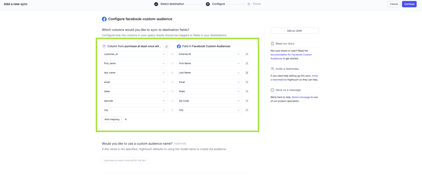 Select the Facebook Audiences destination that you set up and choose which columns you want to sync to Facebook. If you're dealing with PII data you can configure Hightouch automatically hash your data.